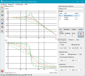 The program can be used to calculate the frequency responses of filter circuits that are designed as linear networks in the form of a two-port with a common reference point. The circuit may contain resistors, capacitors, inductors, and operational amplifiers. The result can be displayed graphically as either a Bode plot or Nyquist plot.
