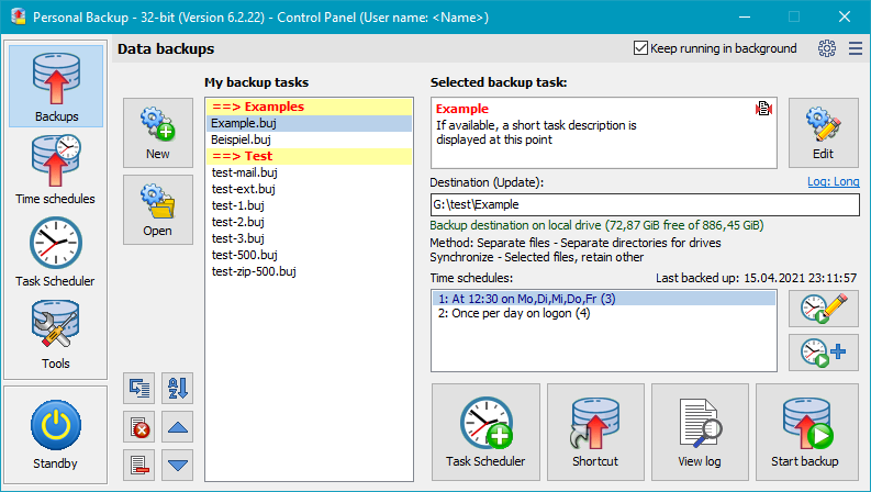 The control panel is a new feature introduced with Version 6 and will inform you about all your configured backup tasks and the associated time schedules for automatic backups in a clearly-arranged form. In addition, you can edit time schedules, configure backups using Windows Task Scheduler as well as call additional tools for restore and verification of backed-up data and to clean up backup directories.