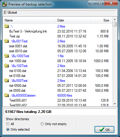 This preview can also be called via a context menu displayed on right-clicking a directory in the Directories to be backed up window and selecting the option Show all selected files. In this context menu there is also the option to Show all excluded files.