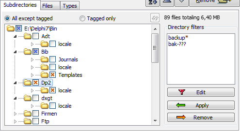 Select the desired filters in the Directory filters window and apply them to your tree by clicking the Apply button. You can similarly undo this selection by clicking the Remove button.