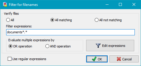 By using filename filters, filenames matching certain patterns may be included or excluded. Use the same rules as described for backup file filters (Standard file filter or Regular expressions).