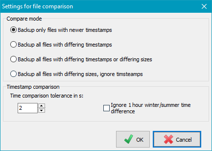 Compare mode: Select which criteria shall be used to decide whether a file is to be backed up or not. Usually (default setting), the timestamps (last write time) of the files are to be compared. For special cases you can select different criteria. The following settings are possible: